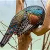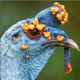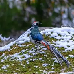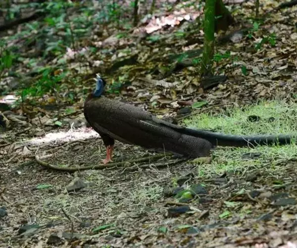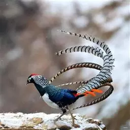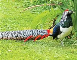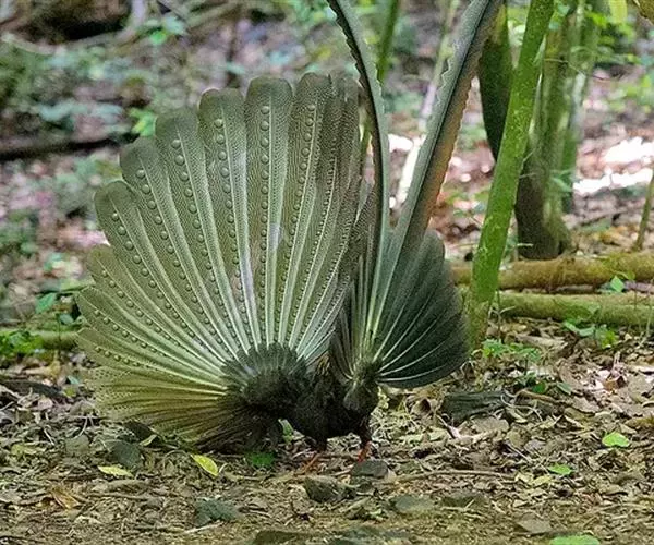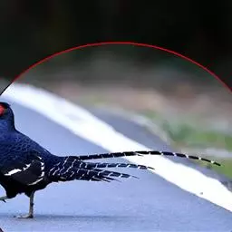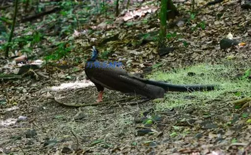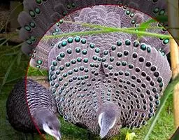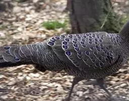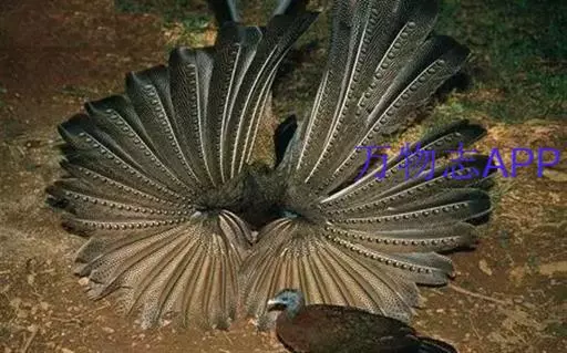 大眼斑雉(学名:Argusianus argus):体长160-200厘米,雄鸟尾长105-143厘米;雌鸟体长72-76厘米,雌鸟尾长30-36厘米;雄鸟体重2040-2725克,雌鸟体重1590-1700克。体羽总体为褐色,头及颈均为蓝色,上胸赤红色,冠及颈背的羽毛黑色,脚呈红色。是东南亚最美丽的鸟类,翅的下端长有多个蓝色斑点,好像一双双明亮的大眼睛,大眼斑雉也由此得名。
