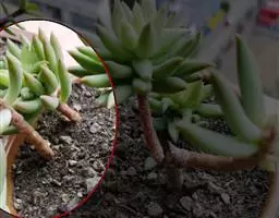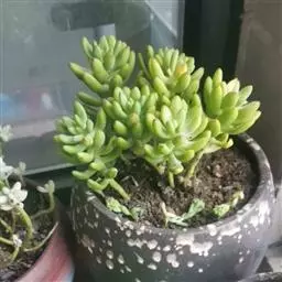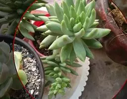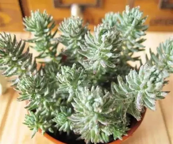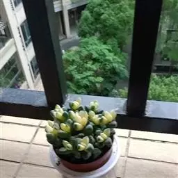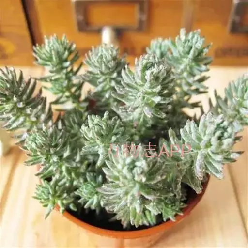 多年生草本,常年蓝绿色,非常的好养,植株叶片交互环生,容易长小侧芽,能够长成大串的一群,时间长了有枝干,枝干无法支撑强大的枝条基本会匍匐生长,簇状花序,花开黄色,异花授粉。