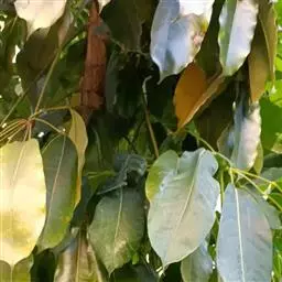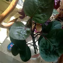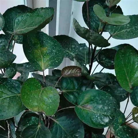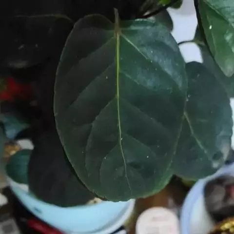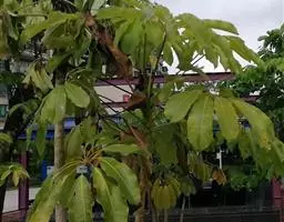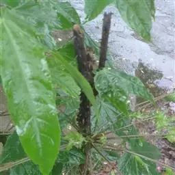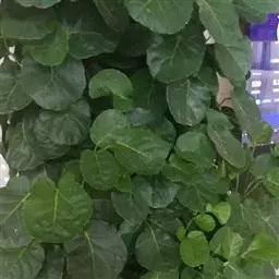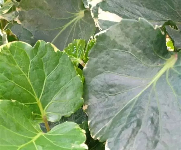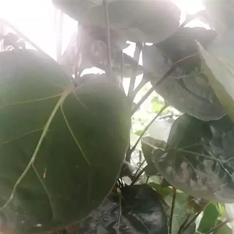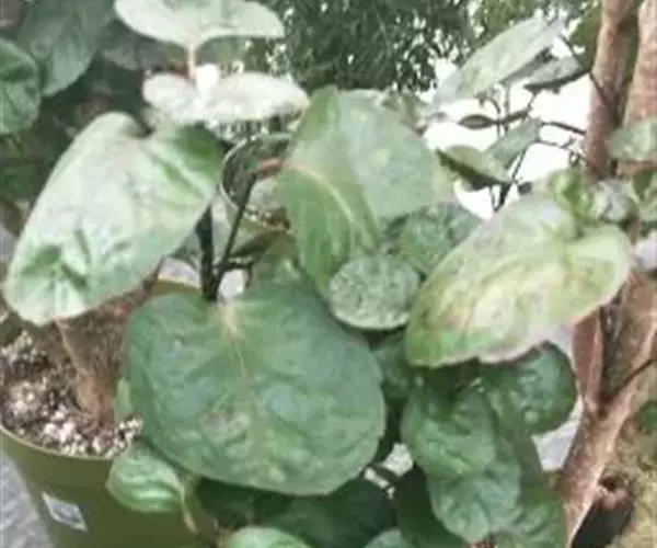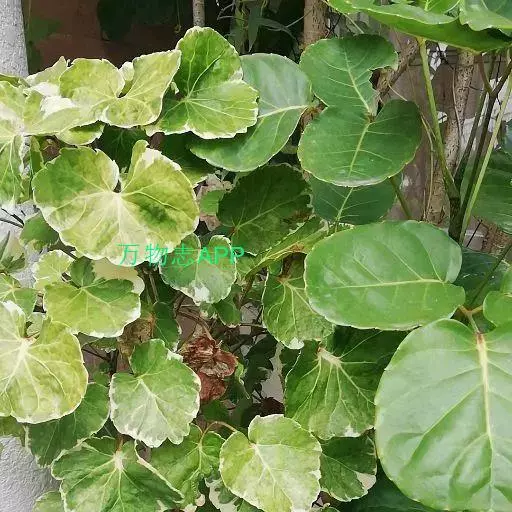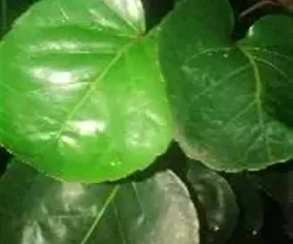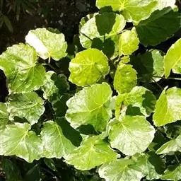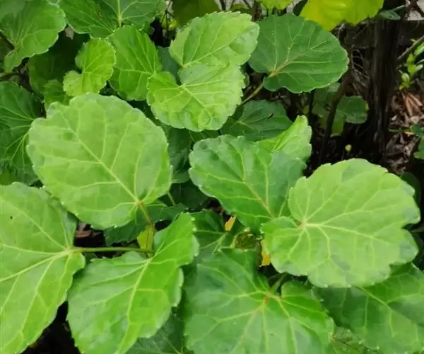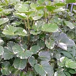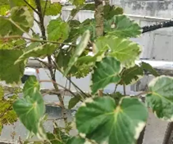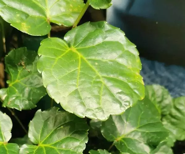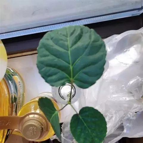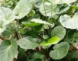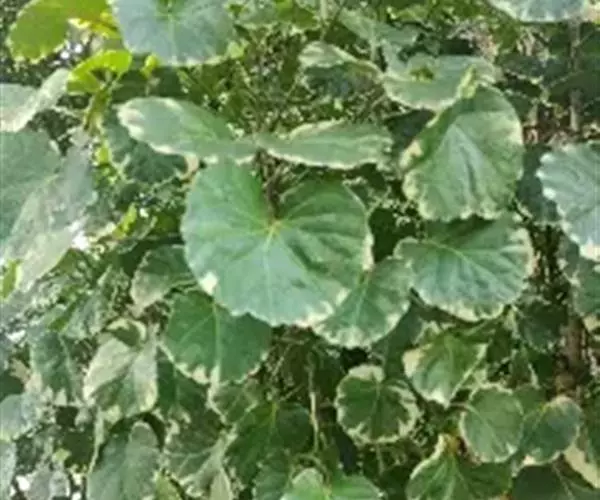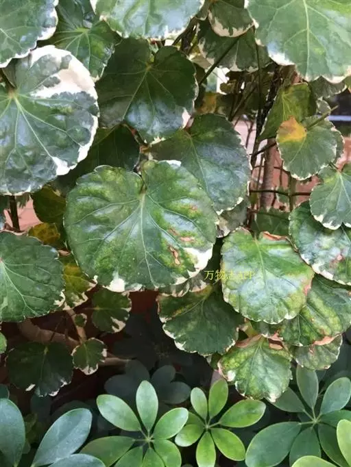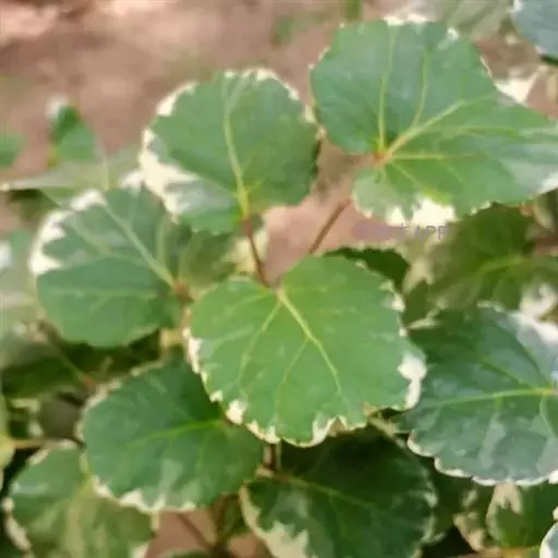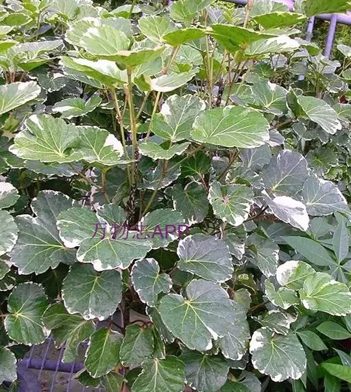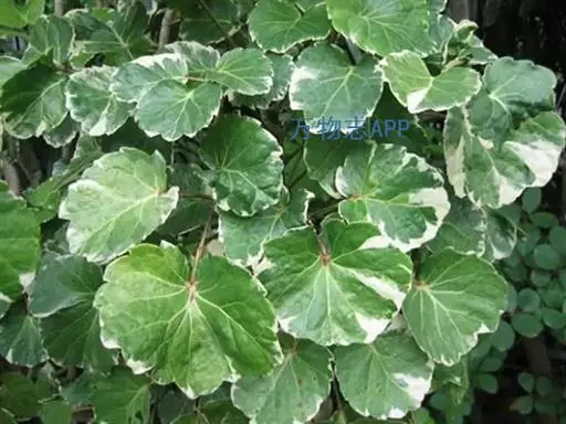 圆叶南洋参 茎带同色,茎枝表面有明显的皮孔。叶为一回羽状复叶,小叶阔圆肾形,直径约为10厘米,叶缘有粗钝锯齿或不故规则浅裂,先端圆,基部歆心形,叶缘稍带白色,薄肉质。