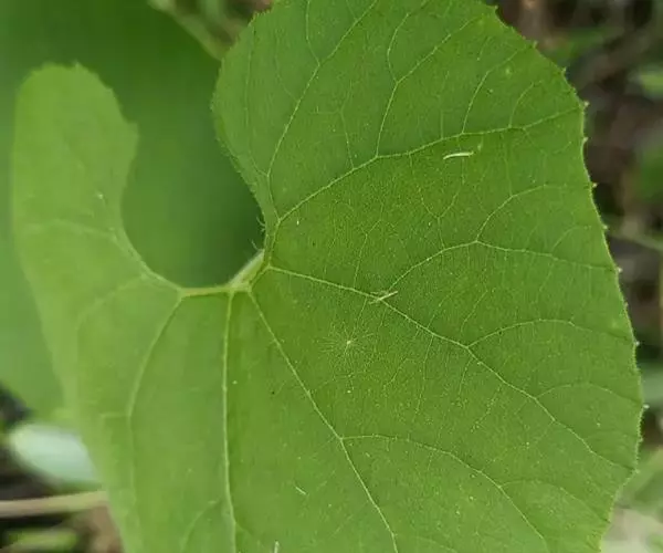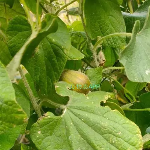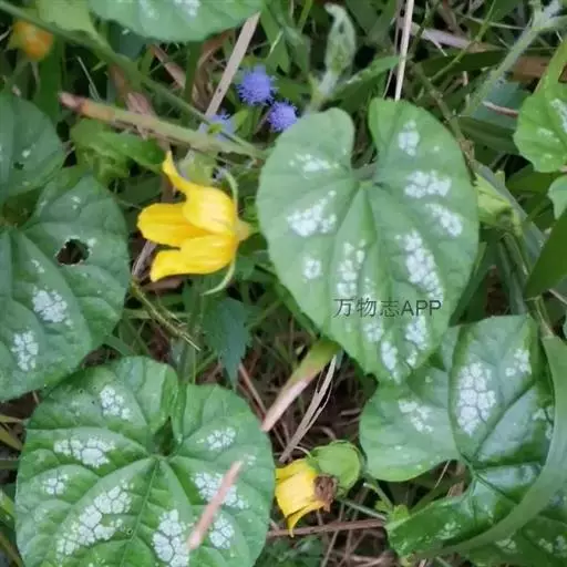 攀援草质藤本,全株被黄白色的长柔毛状硬毛;根块状;茎稍粗壮,有棱沟。叶柄稍粗,长2-6厘米;叶片宽卵状心形,长5-8厘米,宽4-9厘米,边缘浅波状,有大小不等的细齿,先端急尖或短渐尖,基部心形,弯缺深,近圆形或半圆形,深1-1.5厘米,宽1.5-3厘米,两面粗糙,脉上有长硬毛,最基部1对叶脉沿叶基弯缺边缘向外展开。卷须纤细,被长柔毛,单一。