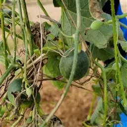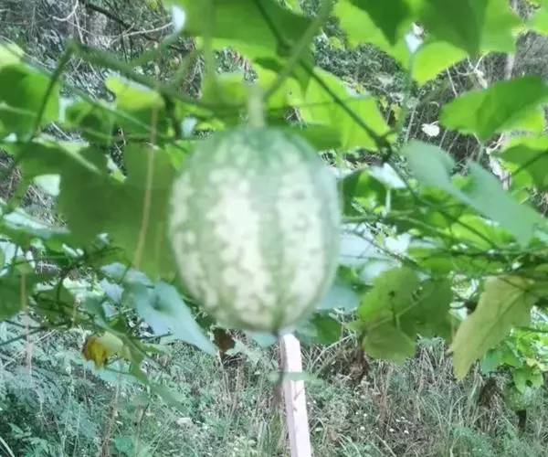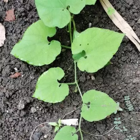 播种后约25天左右出苗。岗地出苗快,洼地山苗较慢。苗高10厘米时定苗,每穴留一株。在上架前,抓紧除草松土三次,过晚茎叶伸展,架条阻扼,不利作业。当苗高50左右时,要搭架,每四穴的架条结扎在一起,然后将各个赤瓟架用横杆联结起来,绑牢即可(搭架方式同豆角架)。当苗高66-83厘米时领蔓,以利植株攀援生长。