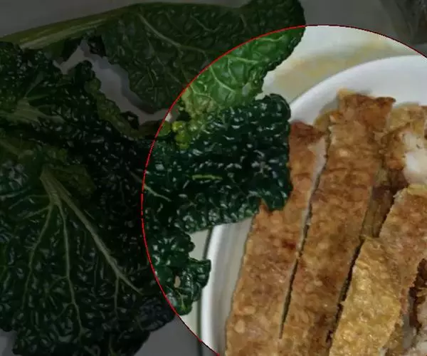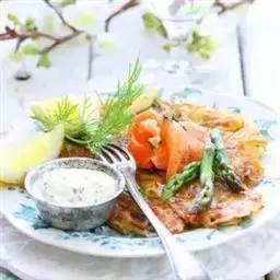 2、起菜时,配上炸土豆条。煮蔬菜、浇上黄油即成。