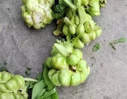 花球:是整株花椰菜体现主要经济价值的产品,由短缩肉质花茎系统组成的球状贮藏器官,它是由肥嫩的茎轴和很多的肉质花梗及绒球状的花枝顶端包括许多分化到花序阶段的花芽原基聚合而成。花球是花椰菜营养贮藏器官,贮有大量营养物质,是人们食用部分。据观察,一个花球主轴上约有50~60个小花球,基部小花球粗2~3cm,中心部的小花球不足Icm。花椰菜的花球组织非常致密,在花枝顶端继续分化的花芽,能开花的是极少数。正常的花球是半球形,球面是规则的左旋辐射轮状排列,表面是颗粒状,质地致密。花球作为上市的产品,洁白匀称,表面无茸毛,能创造更好的经济效益,如遇不良气候或不合适栽培环境,花球会出现“青花”、“毛花”与“紫花”等异常现象而影响了上市。