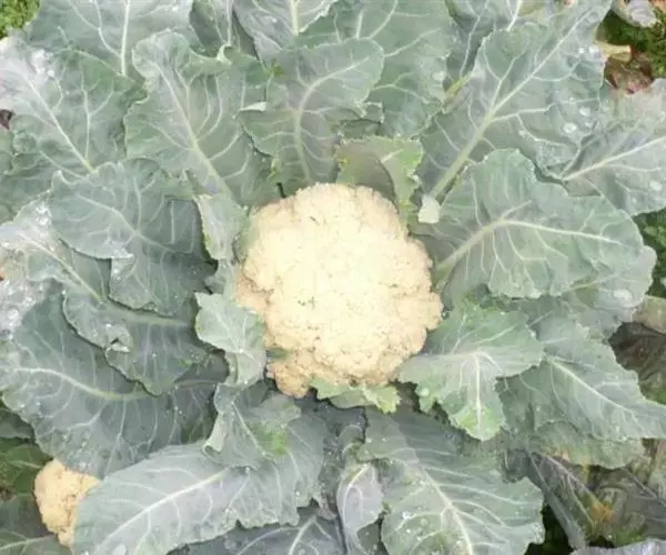 叶:花椰菜的叶分为外叶和内叶两种。外叶开张自外向内,叶片由小逐渐增大有叶柄,到花芽分化以后,不再增大。叶片较大,特别是叶的宽度较大。内叶无叶柄,包被花球,自外向内,叶子逐渐缩小,而外部小叶呈直立性。花椰菜的叶数、叶形、色泽和大小因品种不同而有差异,从第一片真叶到花球外的内叶为止,叶片总数约为18~40片,一般早熟种18~20片,中熟种25一30片,晚熟种30~40片。叶形有卵圆形、长卵圆形、椭圆形、长椭圆形和长披针形等。叶色有浅绿、绿、灰绿、深绿。叶片上还附有腊粉,是叶表皮细胞的分泌物,有减少水分蒸发的作用,腊粉多少因气候、生长栽培环境不同而有差别。