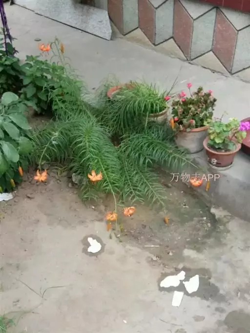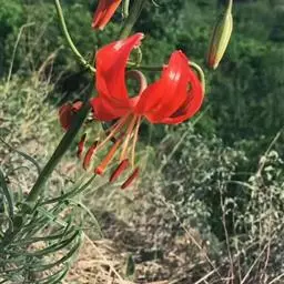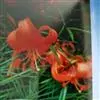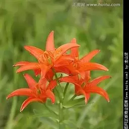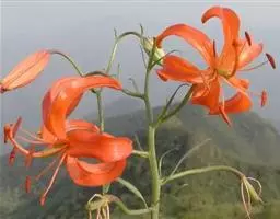 川百合(学名:Lilium davidii Duchartre):鳞茎为扁球形,白色。茎干绿色,上半部有小突起及稀疏的绵毛。叶片散生,为线状披针形, 边缘反卷并有明显的小乳头状突起,中脉明显,往往在上面凹陷,在背面凸出,叶腋有白色绵毛。花下垂,桔红色,花被上有密集的褐色斑点,花被极度反卷,背部疏生白绵毛。花期在7月份,果期在9月份。