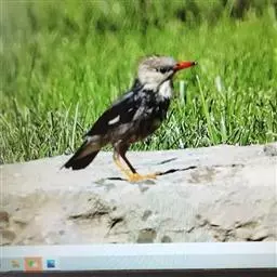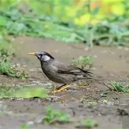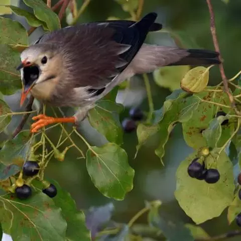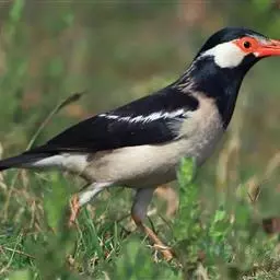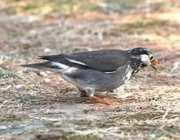 灰椋鸟俗称高梁头,管莲子。为中国常见的候鸟。主要特点是头顶和颈部黑色,前额和头侧白而杂以黑纹,体背面灰褐色,腰及腹部为白色;尾羽黑色,先端具白斑;嘴、脚为橙红色。迁徙时,常成群栖于树上,或旋翔于空中,飞行疾速。其体灰褐色,头上黑,两颊白,野外较易鉴别。