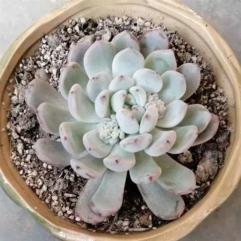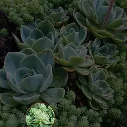 紫珍珠是景天科石莲花属的多年生肉质草本植物。植株中小型;叶片肉质,匙形,呈莲座状紧密排列;叶片粉紫色,…