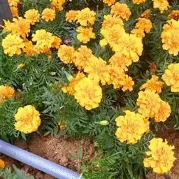 万寿菊是菊科万寿菊属一年生草本植物,别名孔雀菊、缎子花、臭菊花、西番菊、红黄草、小万寿菊、臭芙蓉、孔雀草。万寿菊茎近基部分枝。叶羽状分裂,长5-10厘米,宽4-8厘米,裂片长椭圆形或披针形,具锐齿,上部叶裂片齿端有长细芒,叶缘有少数腺体。头状花序单生,径5-8厘米,花序梗顶端棍棒状。总苞长1.8-2厘米,径1-1.5厘米,杯状,顶端具尖齿。舌状花黄或暗橙黄色,长2.9厘米,舌片倒卵形,长1.4厘米,基部成长爪,先端微弯缺。管状花花冠黄色,长约9毫米,冠檐5齿裂。瘦果线形,被微毛;冠毛有1-2长芒和2-3短而钝鳞片。花期7-9月。万寿菊中国各地均有栽培,在广东和云南南部、东南部已归化,国外原产墨西哥。万寿菊对土壤要求不严,但以肥沃疏松排水良好的土壤为好。耐移栽,种子发芽适温21-24℃,植株生长适合温度为20-29℃。喜温暖和阳光充足的环境,不