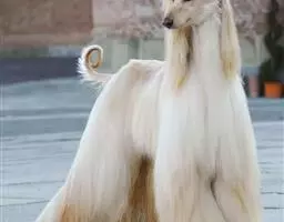 阿富汗猎犬全身披丝绢状的长毛,毛色鲜艳,呈多种颜色,背中线附近毛短,…