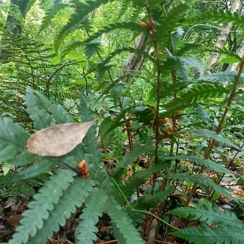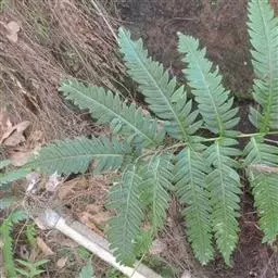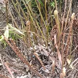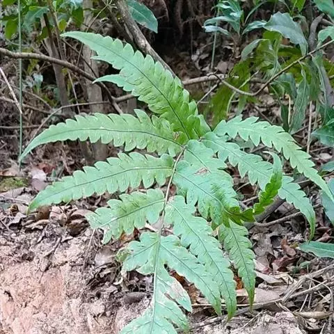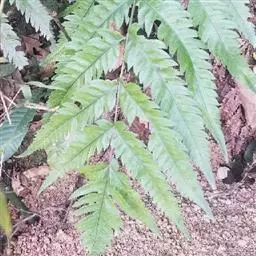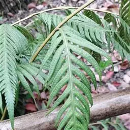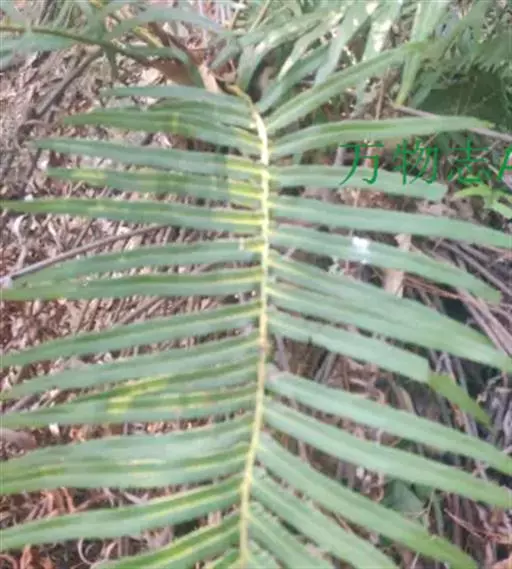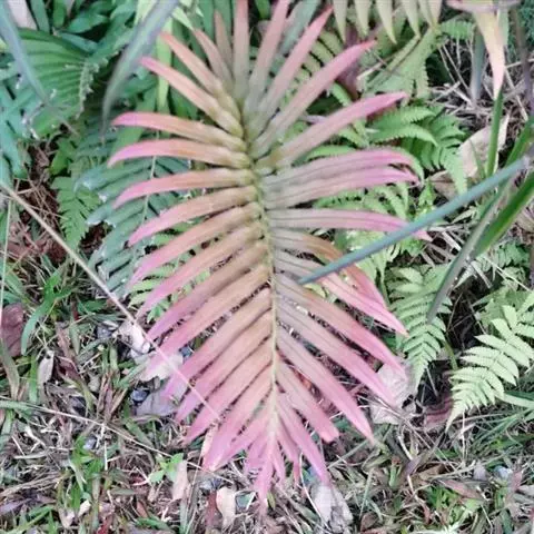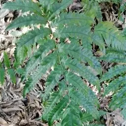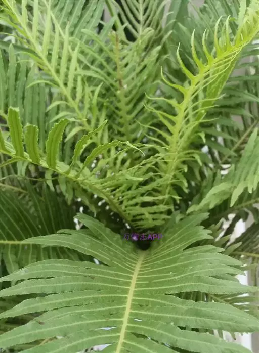 苏铁蕨 土生,大型草本。 植株高达1.5米。主轴直立或斜上,粗约10-15厘米,单一或有时分叉,黑褐色,木质,坚实,顶部与叶柄基部均密被鳞片;鳞片线形,长达3厘米,先端钻状渐尖,边缘略具缘毛,红棕色或褐棕色,有光泽,膜质。