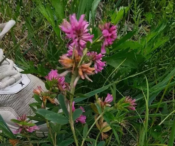 头状花序着生顶端和上部叶腋,具花20-35朵;总花梗长1.3 (-5) 厘米,被柔毛;花序下端具1早落的膜质总苞;花长 (10) 12-17毫米,萼钟形,长6-10毫米,被长柔毛,脉纹10条,萼齿丝状锥尖,比萼筒长2倍;花冠淡红色至紫红色,旗瓣椭圆形,先端钝圆,基部稍窄,几无瓣柄,翼瓣长圆形,下方有一钩状耳,龙骨瓣长圆形,比翼瓣短,先端具小尖喙,基部具长瓣柄;子房狭椭圆形,无毛,具柄,花柱丝状,上部弯成钩状;胚珠5-8粒。