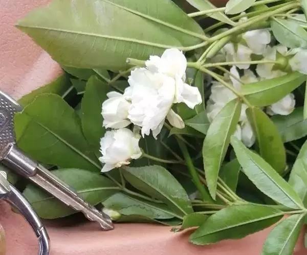 木香花是攀援小灌木植物,高可达6米;小枝圆柱形,无毛,有短小皮刺;老枝上的皮刺较大,坚硬,经栽培后有时枝条无刺。小叶3-5,稀7,连叶柄长4-6厘米;小叶片椭圆状卵形或长圆披针形,长2-5厘米,宽8-18毫米,先端急尖或稍钝,基部近圆形或宽楔形,边缘有紧贴细锯齿,上面无毛,深绿色,下面淡绿色,中脉突起,沿脉有柔毛;小叶柄和叶轴有稀疏柔毛和散生小皮刺;托叶线状披针形,膜质,离生,早落。