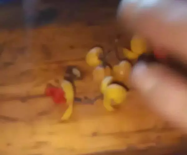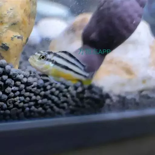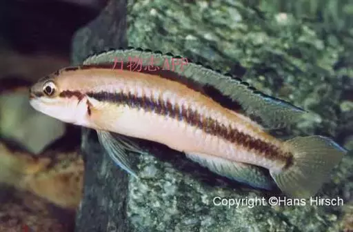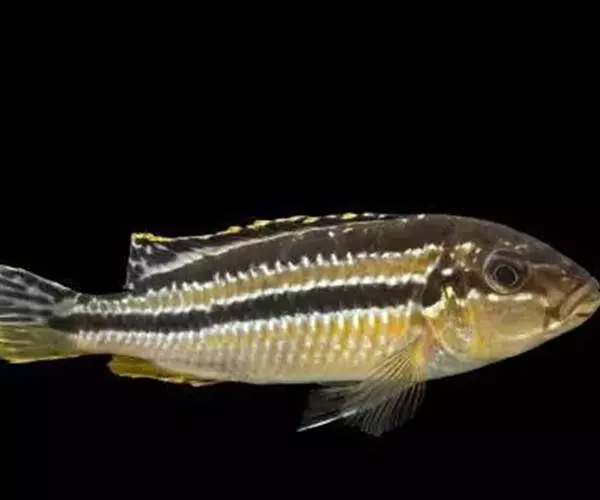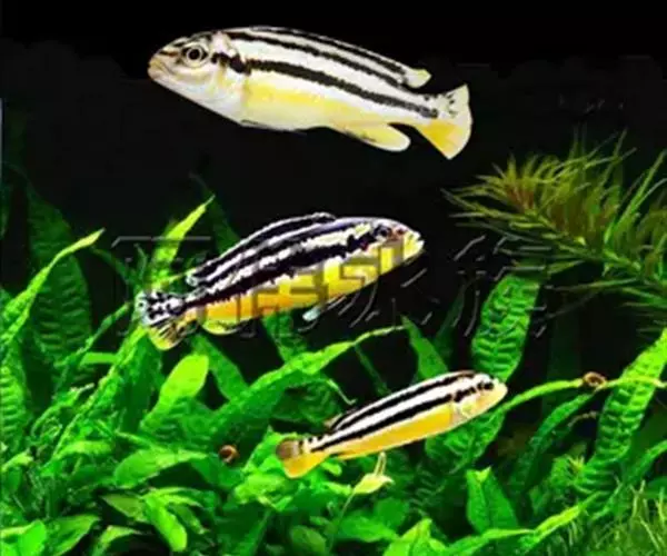 非洲凤凰鱼(Melanochromis auratus),身上的水平斑纹清晰可见。雄鱼只有在雌鱼出现的情况下才会呈现出保卫领域的行为,但一旦雌鱼扫兴而去,雄鱼也就会离开曾经保卫的领域。对于其他的雄鱼,非洲凤凰的雄鱼会表现出极强的攻击性,甚至试图杀死任何黑丽鱼属岩栖类的雄性。由于存在杂交的风险,它们不应该和其他的黑丽鱼属岩栖类混养在一起。非洲凤凰的基础色是明亮的黄色,上面并伴有一条黑色的水平条纹。成熟后雄鱼的腹部变多名为深褐色.