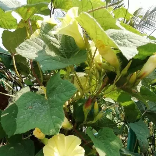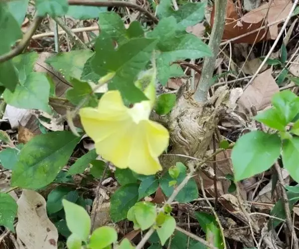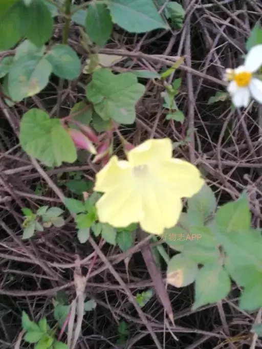 缠绕或平卧草本。茎带紫色,圆柱形,老时具条纹,被疏或密的平展的黄白色微硬毛,有时无毛。叶片轮廓近圆形,长(2-5-)5-15厘米,宽(2.5-)4-15.5厘米,基部心形,通常掌状5裂,有时3裂或7裂,裂片宽三角形或卵状披针形,顶端渐尖,锐尖或钝,基部不收缩或有时稍收缩,边缘具粗锯齿或近全缘,两面被平伏的长的黄白色微硬毛;叶柄长1-3(-19)厘米,毛被同茎。聚伞花序腋生,有1-3朵至数朵花,花序比叶长或与叶近等长,花序梗长2-5厘米,连同花梗、外萼片被黄白色开展的微硬毛;苞片小,钻形,花梗长1-1.6厘米,顶端增粗;萼片长圆形至卵状长圆形,长1.4-1.8厘米,顶端钝圆,具小短尖头,内萼片稍长,无毛,萼片至结果时显著增大,近革质,内面灰白色,有很多窝点;花冠黄色,漏斗状,长2.5-5.5厘米,无毛,冠檐具5钝裂片,瓣中带有5条显著的脉;雄蕊短于萼片,长约1.1厘米,花药螺旋扭曲;子房无毛。蒴果近球形,高约1.2厘米,果皮干后纸质,4瓣裂。种子4或较少,三棱状卵形,高约7毫米,黑褐色,无毛。
