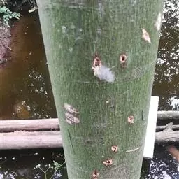 定植 种苗要遵循随到随种、先到先种、常绿树种先于落叶树种植的原则。据苗木深 浅要求,将其放入坑内。栽植深度略深于原来的2~3厘米,具体需根据土壤特性而定,盐 碱度重且粘性较强的土壤宜浅植,相反则深植。带土球苗木剪断草绳(若为麻绳必须取出),边埋土边夯实。裸根树木栽植时,根系要舒展,不得窝根,当填土至坑的1/2时,将苗 木轻轻提几下,再填土、夯实。树木栽好后,做好三角支架或铅丝吊桩。支柱与树干相接部 分要垫上蒲包片,以防磨伤树皮。