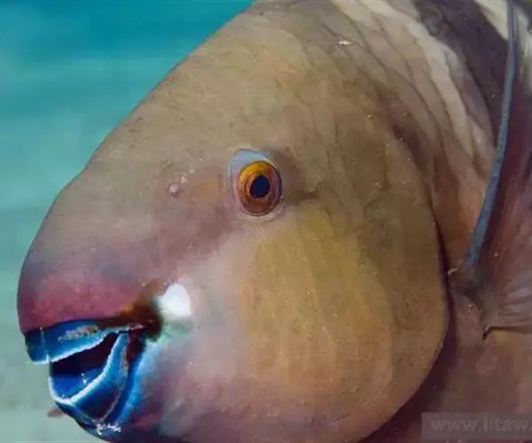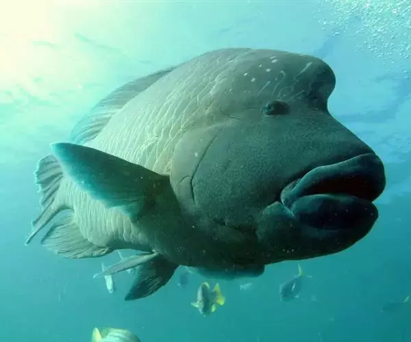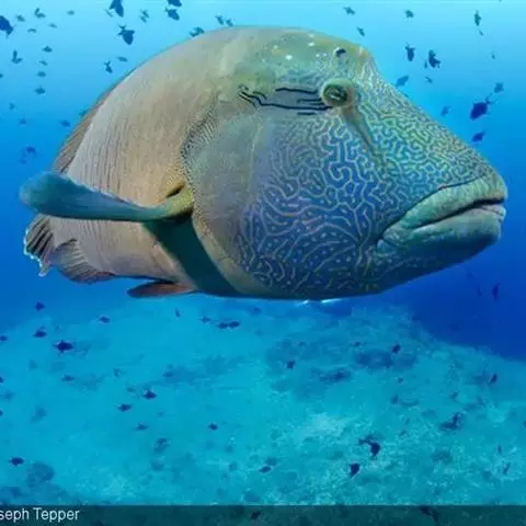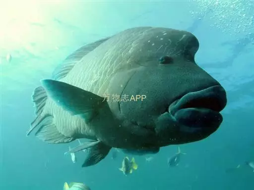 波纹唇鱼(学名:Cheilinus undulatus):体延长而呈长卵圆形;头部轮廓自背部至眼平直,然后凸出;成鱼前额突出口端位,中大;上下颌各具锥形齿一列,前端各有一对大犬齿;前鳃盖骨边缘具锯齿,左右鳃膜愈合,不与峡部相逢体被大形圆鳞。成鱼背鳍与臀鳍后部延长,达尾鳍基部;尾鳍圆形;老成鱼腹鳍可达肛门之后。幼鱼体浅绿色,每一鳞片具黑纹;眼后具2条黑纹。成鱼体绿色,体侧每一鳞片具黄绿色及灰绿色横线;头具橙色与绿色的网状细线;奇鳍密部细斜线;尾鳍后缘黄色。主要栖息于很陡的礁岩斜坡,海流道斜坡和泻湖的礁岩上,深度从2-60米左右。通常单独出现,偶尔会成对出现。是隆头鱼科中的大型种,个性温和,容易与人亲近。肉食性,以鱼类及底栖性动物为主要食物。波纹唇鱼是一种热带地区近海海域生存的著名巨型鱼类。分布于大洋洲、太平洋西部热带海域、大堡礁、印度洋西北部及红海。其体型巨大味道鲜美,被作为名贵食用鱼,在海洋馆或大型展示鱼缸中亦可作为观赏鱼。