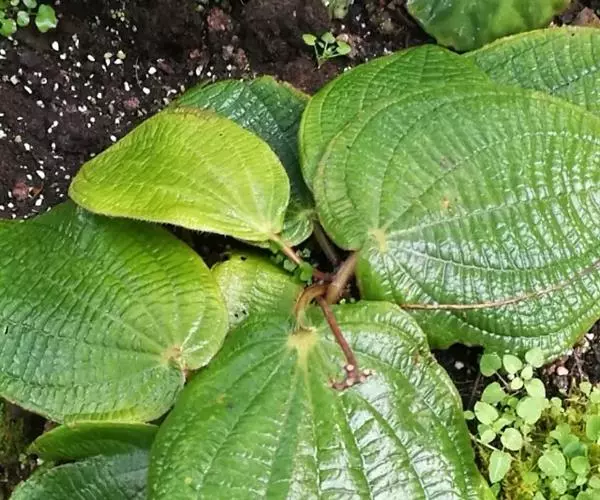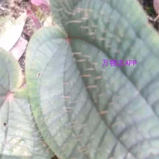 草本,茎极短,被红色粗硬毛,具粗短的根状茎,长约6厘米,略木质化。叶基生,叶片膜质,心形,顶端近圆形,基部心形,长宽20-30厘米或更大,边缘具不整齐的啮蚀状细齿,具缘毛,基出脉9,叶面无毛,基出脉平整,侧脉及细脉微隆起,背面密被糠秕,脉均隆起,明显,被红色长柔毛及微柔毛;叶柄圆柱形,肉质,长10-17厘米或更长,被红色粗硬毛,具槽。