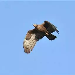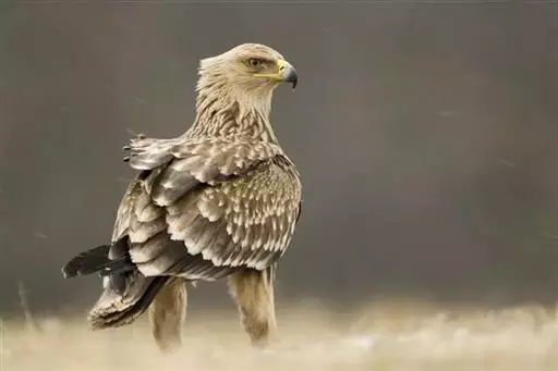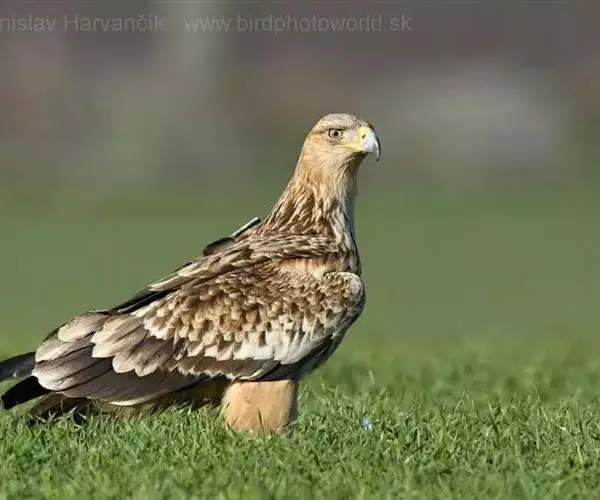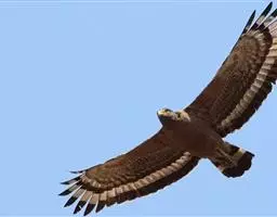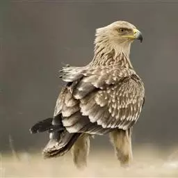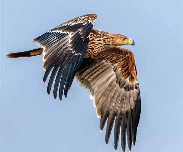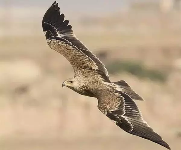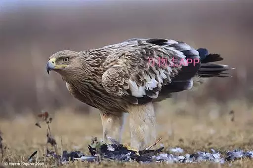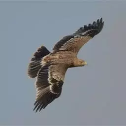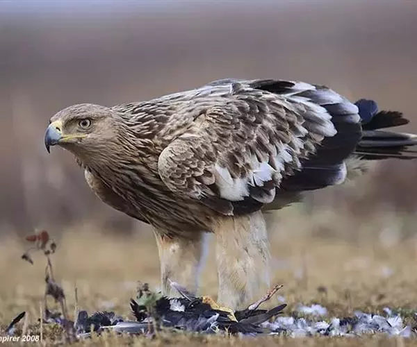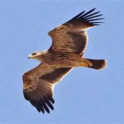 白肩雕(学名:Aquila heliaca):又名御雕,是大型猛禽。体长73-84厘米。体羽黑褐色,头和颈较淡,肩部有明显的白斑,在黑褐色的体羽上极为醒目,很远即可看见,这是区别其他雕的主要特征。滑翔时两翅平直,滑翔和翱翔时两翅亦不上举成‘V’字形;同时飞翔时尾羽收得很紧,不散开,因而尾显得较窄长。幼鸟头皮黄褐色,背具黄褐色斑点,飞翔时尾常散开成扇形。