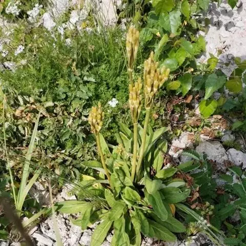 多年生草本,具极短的根茎和成丛的粗长支根。叶椭圆状倒披针形,长10-22(30)厘米,宽3-8(10)厘米,先端钝或圆形,基部渐狭窄,下延至叶柄,边缘具稍不整齐的小牙齿,下面被粉质腺体,中肋宽扁,红色,侧脉常多达15对,与中肋成45度角;叶柄长为叶片的1/4-1/2,红色,具翅。