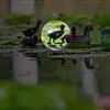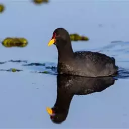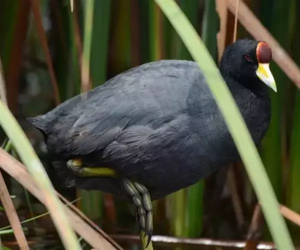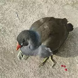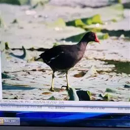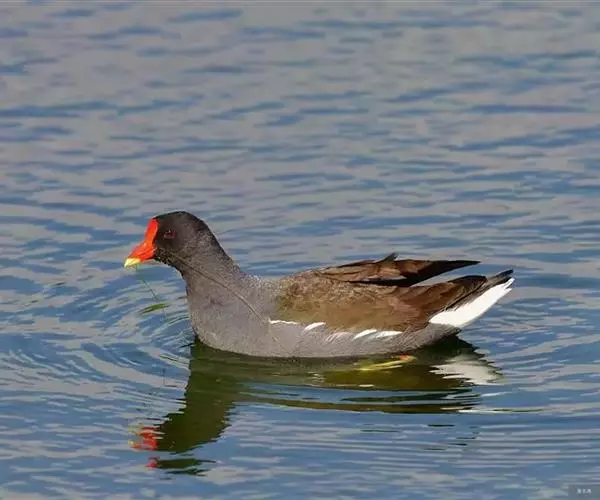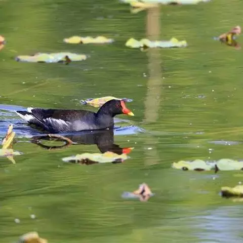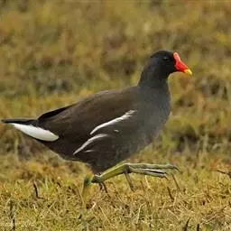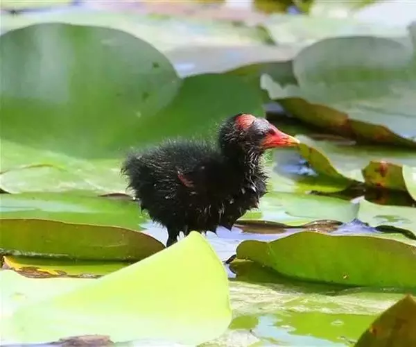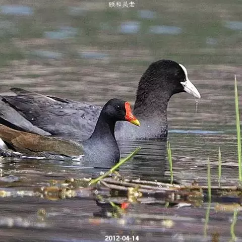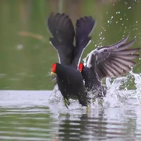 红冠水鸡,拉丁名:Gallinula chloropus,中文名:黑水鸡,又名红冠水鸡、红骨顶、红鸟、江鸡;英文名:Common Moorhen,属鹤形目秧鸡科水鸡属,是中型涉禽。全体大致黑色。嘴红色,嘴尖端黄色,脚绿色。遍及全世界,在北纬32度以南越冬。多见于湖泊、池塘及运河,不善飞,起飞前先在水上助跑很长一段距离。黑水鸡已被列入国家三有保护鸟类。黑水鸡雏鸟黑色,幼鸟和亚成鸟转为灰白色,至成鸟又转为黑色。