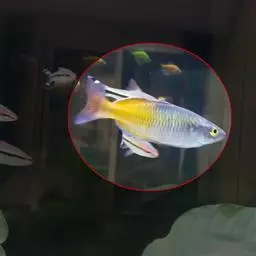 眼斑双锯鱼,背鳍硬棘被橘黄色斑块分割为5-6枚,第4枚最长,约为头长的2.1-2.9倍。胸鳍、臀鳍…