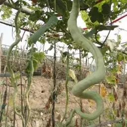 蛇瓜一年生攀援藤本;茎纤细,多分枝,具纵棱及槽,被短柔毛及疏被长柔毛状长硬毛。蛇瓜的根系发达,侧根多,易生不定根,茎蔓细长,长可达5~8米,茎五棱、绿色,分枝能力强,叶片绿色,掌状深裂,裂口较圆,叶面有细绒毛,花冠白色,花单性,雌雄同样异化,雄花多为总状花序,蕾期为青绿色,将开时浅黄绿色,雄花的发生早于雌花,一般雌花于主蔓20~25节处开始着生,以后主蔓、侧蔓均能连续着生雌花。