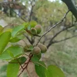 果实形状和大小均有变异,卵形、宽椭圆形或扁圆形,直径(3)5-7(12)厘米,长几与宽相等,色泽变化由淡绿白色至橙黄色,常在向阳面具红晕,外面密被短柔毛,稀无毛,腹缝明显,果梗短而深入果洼;果肉白色、浅绿白色、黄色、橙黄色或红色,多汁有香味,甜或酸甜;核大,离核或粘核,椭圆形或近圆形,两侧扁平,顶端渐尖,表面具纵、横沟纹和孔穴;种仁味苦,稀味甜。花期3-4月,果实成熟期因品种而异,通常为8-9月。