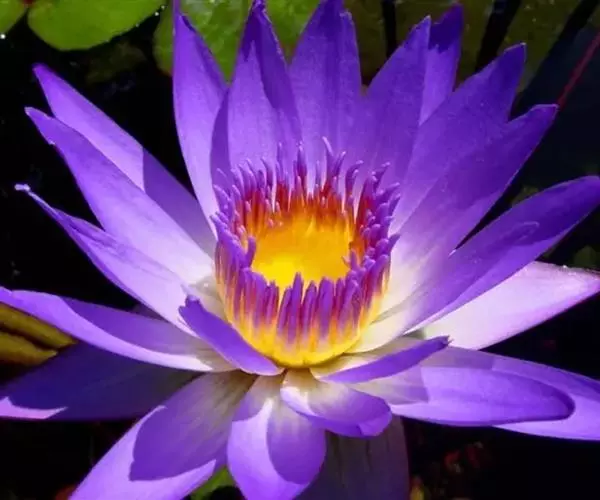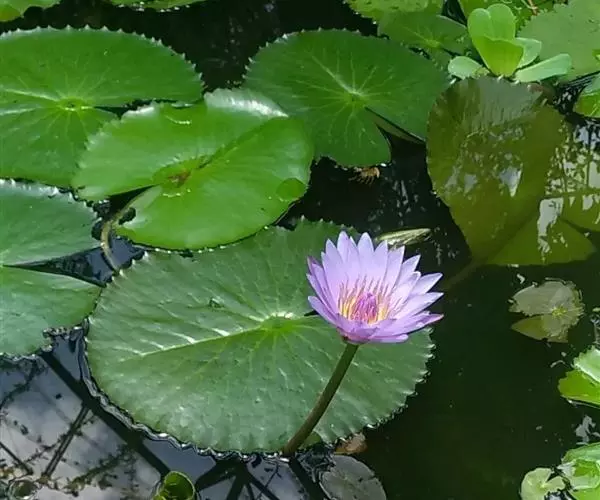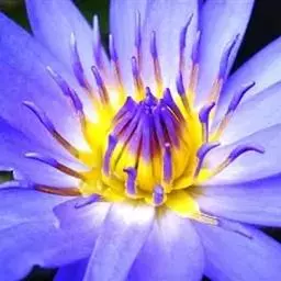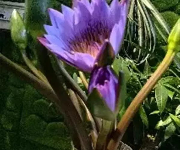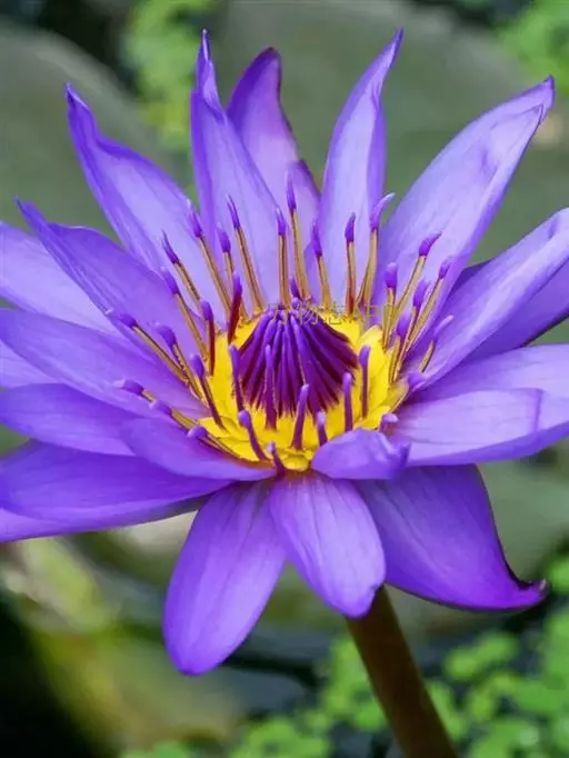 延药睡莲(学名:Nymphaea stellata Willd. ):是多年生水生草本;根状茎肥厚。叶二型:浮水叶圆形或卵形,基部具弯缺,心形或箭形,常无出水叶;沉水叶薄膜质,脆弱。花形美丽,浮在或高出水面;萼片4,近离生;花瓣成多轮,心皮环状,贴生且半沉没在肉质杯状花托,且在下部与其部分地愈合,上部延伸成花柱,柱头成凹入柱头盘,胚珠倒生,垂生在子房内壁。浆果海绵质,不规则开裂,在水面下成熟;种子坚硬,为胶质物包裹。栽培供观赏。