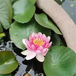 在中国荷文化史上,盆荷这种形式出现之初只是被用于私家庭院观赏。盆栽和池栽相结合的布置手法,提高了盆荷的观赏价值,在园林水景和园林小品中经常出现。睡莲水石盆景是一种新的盆景。它是睡莲盆栽与水石盆景的有机结合,既体现山石的刚毅挺拔,又显示出娇艳妩媚。