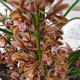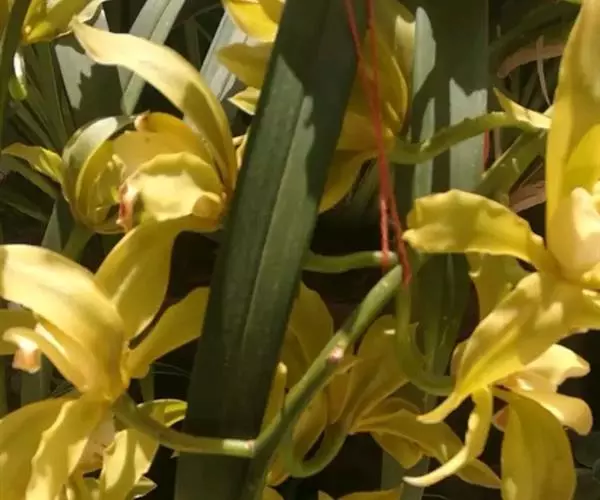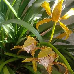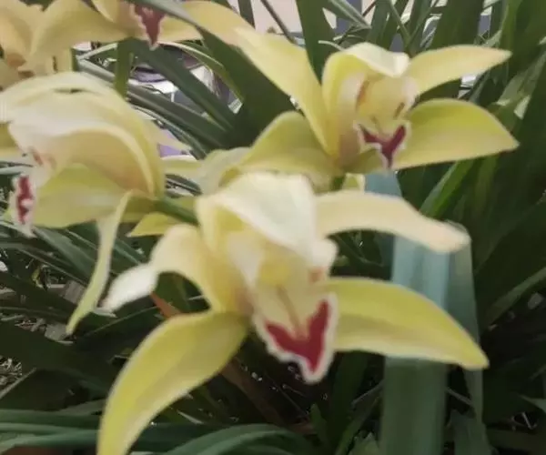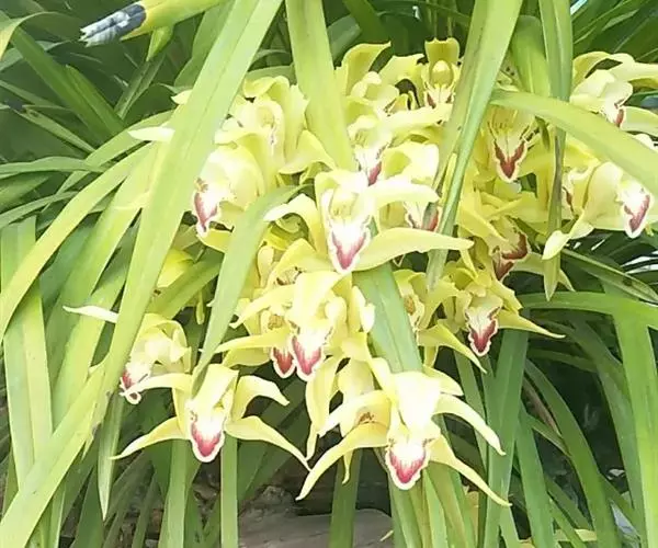 碧玉兰(学名:Cymbidium lowianum (Rchb. f.) Rchb. f.):附生植物;假鳞茎狭椭圆形,略压扁,长6-13厘米,宽2-5厘米,包藏于叶基之内。叶5-7枚,带形,长65-80厘米,宽2-3.6厘米。花葶从假鳞茎基部穿鞘而出,近直立;总状花序具10-20朵或更多的花;萼片和花瓣苹果绿色或黄绿色,有红褐色纵脉,唇瓣淡黄色;花瓣狭倒卵状长圆形。花期4-5月。