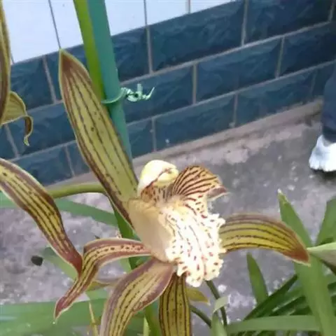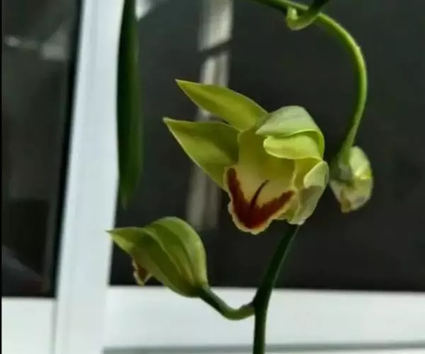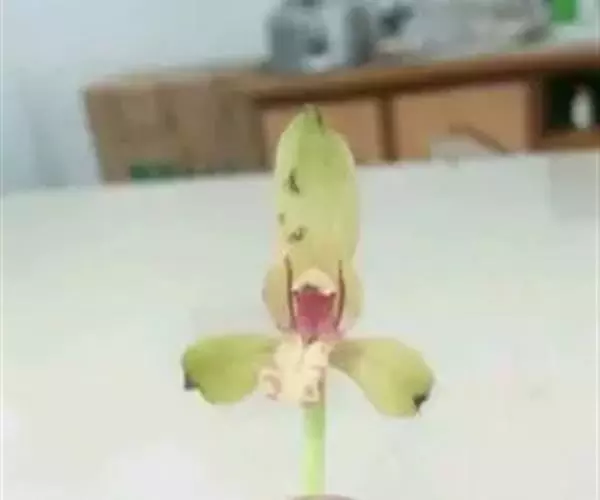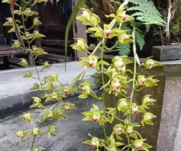 花葶从假鳞茎基部穿鞘而出,近直立、平展或外弯,长60-80厘米;总状花序具10-20朵或更多的花;花苞片卵状三角形,长约3毫米;花梗和子房长3-4厘米;花直径7-9厘米,无香气;萼片和花瓣苹果绿色或黄绿色,有红褐色纵脉,唇瓣淡黄色,中裂片上有深红色的锚形斑(或V形斑及1条中线);萼片狭倒卵状长圆形,长4-5厘米,宽1.4-1.6厘米。