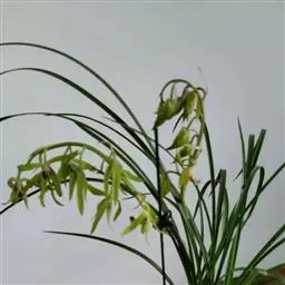 碧玉兰是附生植物;假鳞茎狭椭圆形,略压扁,长6-13厘米,宽2-5厘米,包藏于叶基之内。叶5-7枚,带形,长65-80厘米,宽2-3.6厘米,先端短渐尖或近急尖,关节位于距基部6-9厘米处。