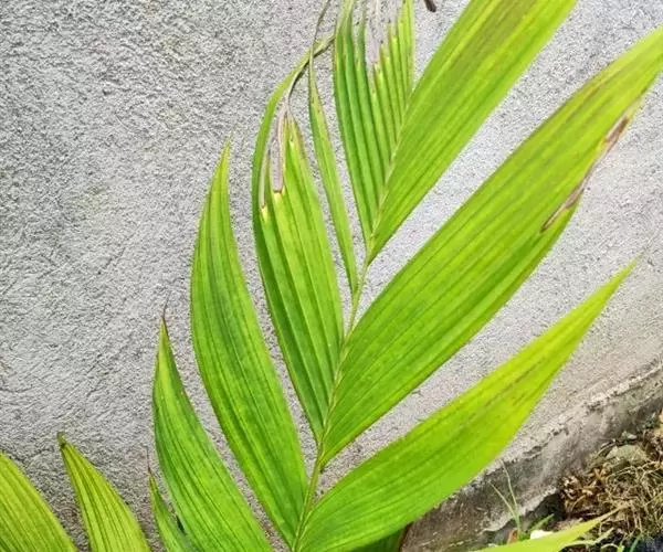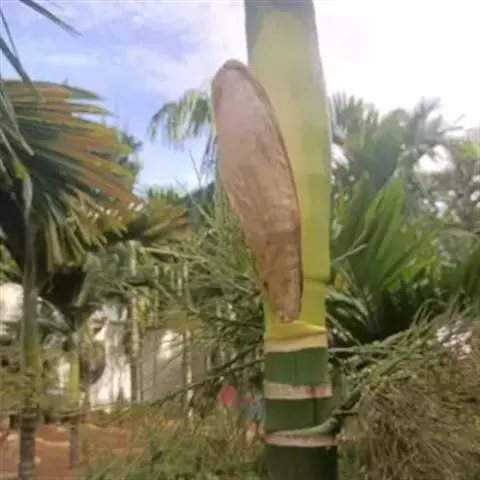 茎丛生,高3-4米或更高,直径2.5-4厘米,具明显的环状叶痕。叶羽状全裂,长1米或更长,约17对羽片,顶端1对合生,羽片长35-60厘米或更长,宽4.5-6.5厘米,具2-6条肋脉,下部和中部的羽片披针形,镰刀状渐尖,上部及顶端羽片较短而稍钝,具齿裂;叶柄长10厘米或更长。佛焰苞1个,革质,压扁,光滑,长30厘米或更长,开花后脱落。