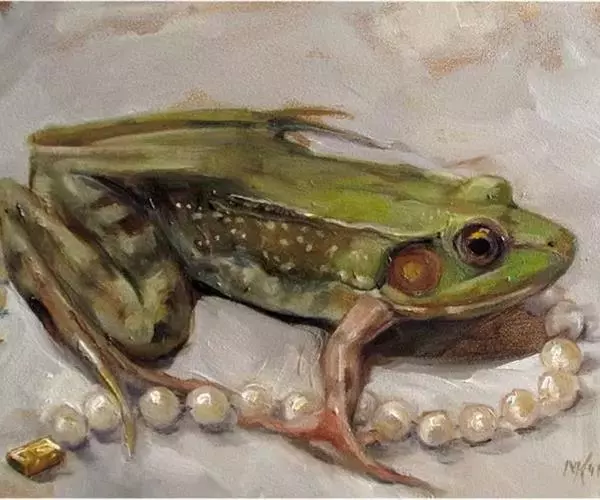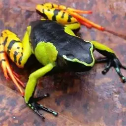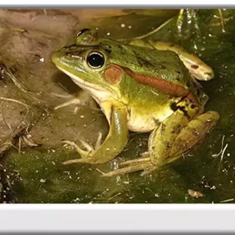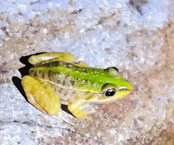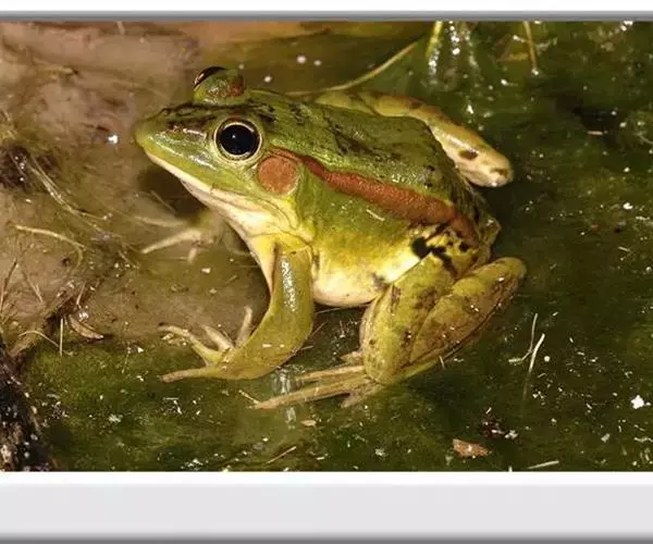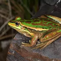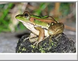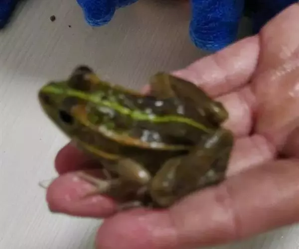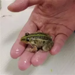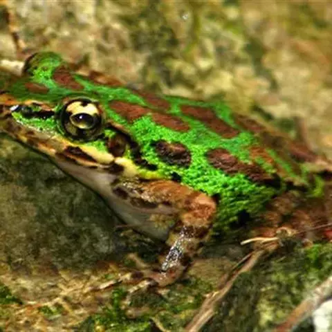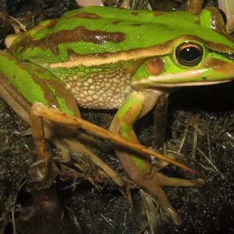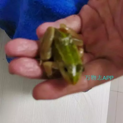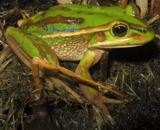金线蛙 金线蛙体型肥硕,成年体长约50毫米(雄体略小),头长约等于头宽,吻端钝圆。鼓膜大而明显棕黄色,颞褶不显著。背部绿色杂有一些黑色斑点,有两长条褐色斑,从吻端一直延伸到泄殖腔口,形成明显的绿色的背中线。体侧绿色有些黑斑,两侧各有一条粗大的褐色、白色或浅绿色的背侧褶。皮肤光滑,但在背部及体侧有些疣粒。腹部光滑,黄白色带有一些棕色点。前肢指细长无蹼。后肢粗短有黑色横带,趾间蹼发达为全蹼。股部内侧黑色有许多小白斑。雌蛙体型比雄蛙大很多。雄蛙有一对咽侧内鸣囊,第一指有婚埝。