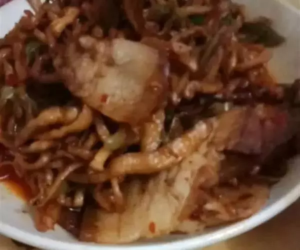 9、焖的过程中要开锅查看,并再次倒入一些猪骨汤或适量清水。看到面条透亮吸饱了菜的汤汁后即可关火。盛到碗里,洒上蒜粒即可。