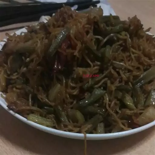 3、将葱花和豆角投入瓢内煸 炒,待豆角发翠绿时,加入酱油、精盐,翻炒均匀,再加入约100我汪水,然后将面条拨散,均匀地铺撒在豆角上,用锅盖盖严瓢面,中火焖制。约3分钟后揭开锅盖,用筷子累累拨散面条,再加入清水少许(要根据瓢内水分多少而定,水多则可使面条成疙瘩,水少则要糊锅)盖严锅盖,再焖约3分钟(焖制中要注意水分),面条即熟。这时揭去锅盖,用筷子将调味汁均匀地淋洒在面条上(即可撤锅),一手拿小铁铲,一手用筷子将面条一豆角翻搅均匀,食时盛入碗内即成。