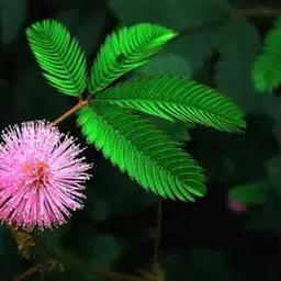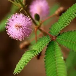 含羞草(学名:Mimosa pudica Linn. ):为豆科多年生草本或亚灌木,由于叶子会对热和光产生反应,受到外力触碰会立即闭合,所以得名含羞草。形状似绒球。开花后结荚果,果实呈扁圆形。叶为羽毛状复叶互生,呈掌状排列。大约在盛夏以后开花,头状花序长圆形,2-3个生于叶腋。花为白色、粉红色,花萼钟状,有8个微小萼齿,花瓣四裂,雄蕊四枚,子房无毛。荚果扁平,每荚节有1颗种子,成熟时节间脱落。花期9月。