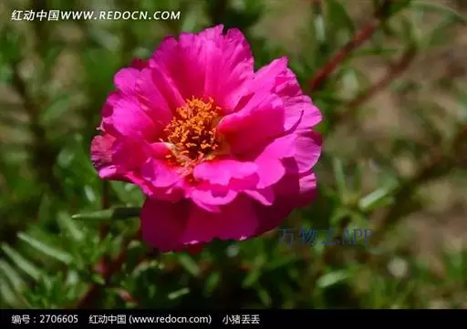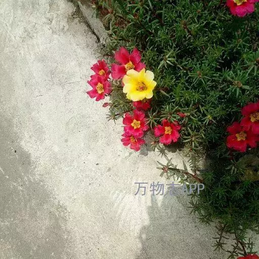 大花马齿苋(学名:Portulaca grandiflora Hook.):一年生草本,高10-30厘米。茎平卧或斜升,紫红色,多分枝,节上丛生毛。叶密集枝端,较下的叶分开,不规则互生,叶片细圆柱形,无毛。花单生或数朵簇生枝端,直径2.5-4厘米,日开夜闭;总苞8-9片,叶状,轮生,具白色长柔毛;花瓣5或重瓣,倒卵形,顶端微凹,长12-30毫米,红色、紫色或黄白色。蒴果近椭圆形,盖裂;种子细小,多数,圆肾形,直径不及1毫米。花期6-9月,果期8-11月。