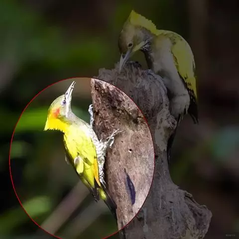 竹啄木鸟云南亚种头部橄榄金黄色,上体橄榄黄绿色,尾黑而基部橄榄色,下体橄榄褐色,雄鸟头顶及枕绯红。东南亚种头浅皮黄,上体橄榄绿色沾红,尾绯红褐具浅栗色横斑,下体深橄榄绿色,雄鸟头顶及枕部玫红沾橘黄色。