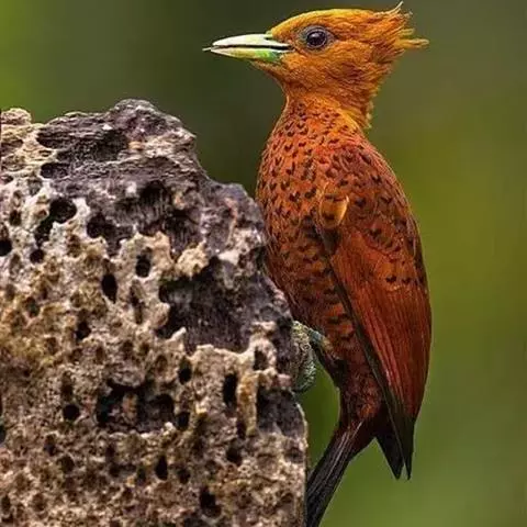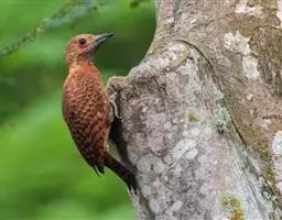 栗啄木鸟:是一种红褐色啄木鸟,体长21厘米。雄性成鸟整个头棕色,…