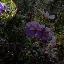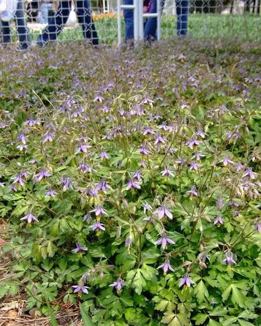 花3-6朵,近直立;苞片线状深裂;花梗长2-4厘米;萼片开展,蓝紫色,罕为白色,卵形,长1.5-2厘米,宽0.9-1.2厘米,顶端钝;花瓣瓣片钝圆形,长3-5毫米,具短距,距长3-5毫米,末端直或微弯;雄蕊比萼片短,花药黄色;退化雄蕊狭椭圆形,白膜质,长5-6毫米,边缘皱曲;心皮5,被腺状柔毛。