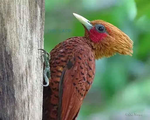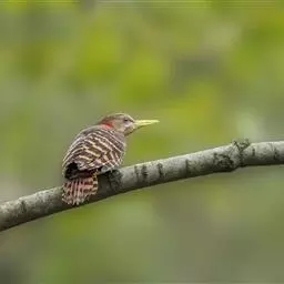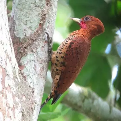 栗啄木鸟(学名:Micropternus brachyurus):是一种红褐色啄木鸟,体长21厘米。雄性成鸟整个头棕色,但稍淡;眼下有一宽阔血红色纵纹;翕部深棕色,背、腰、尾上覆羽、尾羽也是深棕色;除尾羽外,各羽均具黑色横斑;尾羽则具黑色点斑;翼也是深棕色,不论飞羽和覆羽,均具宽阔的黑色横斑,而第1-3片初级飞羽,端部全为黑色。下体的颏、喉浅棕色,各羽均具棕白色羽缘;胸、腹、尾下覆羽、两胁也是深棕色,腹部羽毛末端有污黑色,两胁羽毛有黑色横斑。