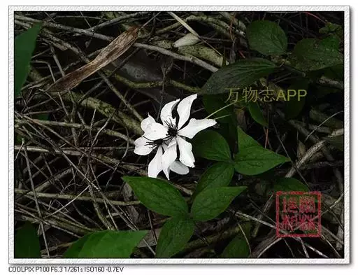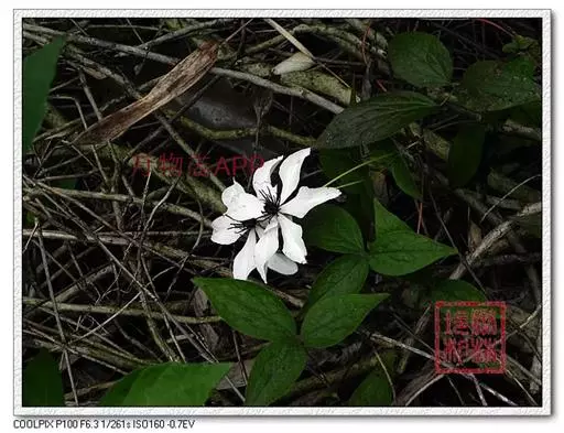 大花威灵仙 2011年5月摄于浙江西部山区 ,本质藤本,长2-4m。须根黄褐色,新鲁时微辣。茎圆柱形,棕红色或深棕色,幼时被开展的柔毛,后脱落近无毛。叶对生,三出复叶或二回二出复叶;叶柄长6-11cm,基部微膨大;小叶片薄纸质或亚革质,长圆形或卵状披我形,长5-7cm,宽2-3.5cm,先端渐尖,基部阔楔形,全缘,上面主脉被短柔毛,下面被柔毛;小叶柄短或长1-2cm,被柔毛。