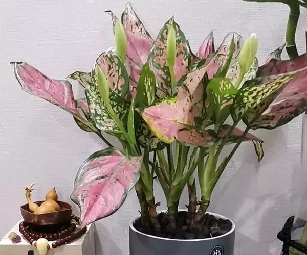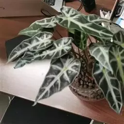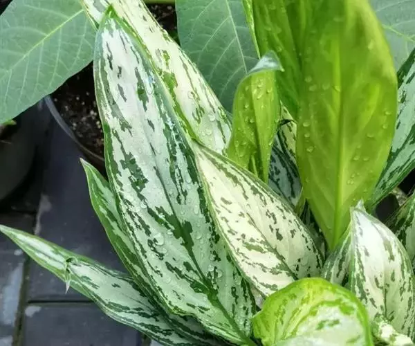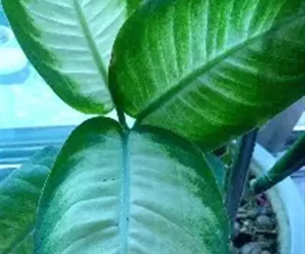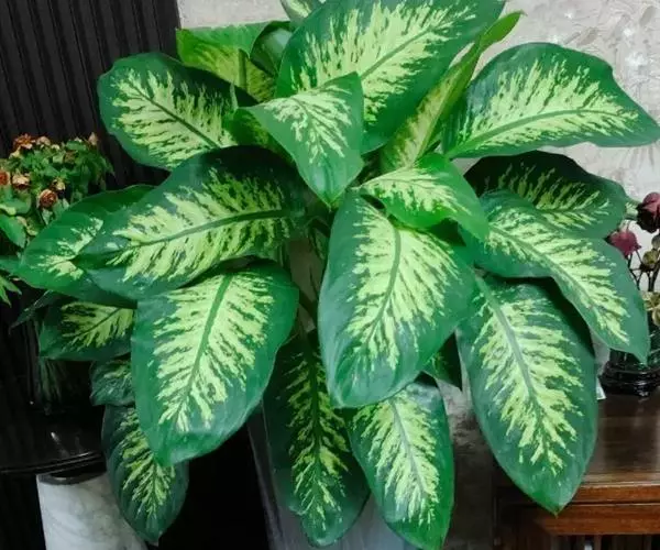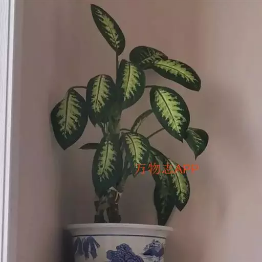 花叶万年青(学名:Dieffenbachia picta Lodd. )又名黛粉叶,为常绿灌木状草本,茎干粗壮多肉质,株高可达1.5米。叶片大而光亮,着生于茎干上部,椭圆状卵圆形或宽披针形,先端渐尖,全缘,长20-50厘米、宽5-15厘米;宽大的叶片两面深绿色,其上镶嵌着密集、不规则的白色、乳白、淡黄色等色彩不一的斑点,斑纹或斑块;叶鞘近中部下具叶柄。花梗由叶梢中抽出,短于叶柄,花单性,佛焰花序,佛焰苞呈椭圆形,下部呈筒状。其园艺品种甚多,不同的品种叶片上的花纹不同。