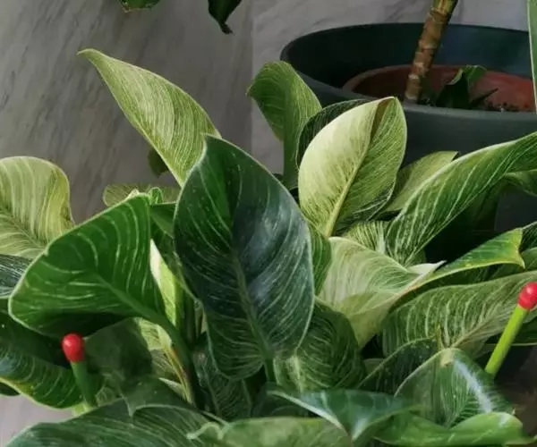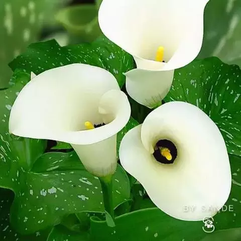 花叶万年青茎高1米,粗1.5-2.5厘米,节间长2-4厘米;下部的叶柄具长鞘,中部的叶柄达中部具鞘,上部叶柄长,鞘几达顶端,有宽槽;叶片长圆形、长圆状椭圆形或长圆状披针形,长15-30厘米,宽7-12厘米,基部圆形或锐尖,先端稍狭具锐尖头,二面暗绿色,发亮,脉间有许多大小不同的长圆形或线状长圆形斑块,斑块白色或黄绿色,不整齐;1级侧脉15-20对,上举,II级侧脉较纤细,背面隆起。花序柄短。佛焰苞长圆披针形,狭长,骤尖。肉穗花序