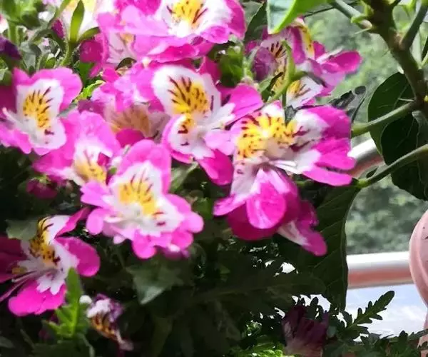 圆锥花序顶生。花多数,花冠3-4厘米,花瓣5片,平展,其中3片花瓣的基部为红色、紫色、堇色,白色,其上镶嵌着红色或紫色的脉纹或斑点,花瓣外沿有红色,艳粉、淡紫、白色等,另有3片花瓣呈盔状,有深裂,一朵花上多种颜色,十分艳丽,花后结籽,蒴果2裂,种小肾形。8-9月份播种,次年春季开花;早春播种,夏季开花。 [2-3]