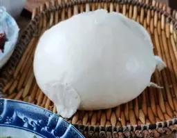 8、把剂子按扁,将剂子擀成圆形面皮。
