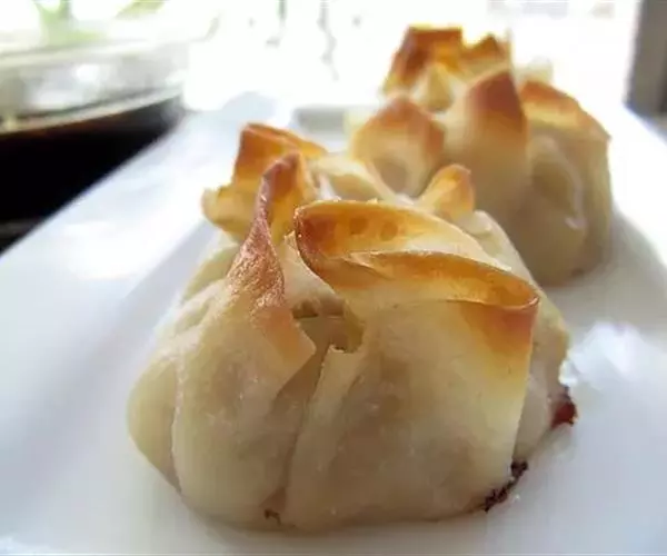 烤包子主要是在馕坑烤制。包子皮用死面擀薄,四边折合成方形。包子馅用羊肉丁、羊尾巴油丁、洋葱、孜然粉(孜然,是新疆地产的一种香料,带有特殊的香味,可以提香去膻,是制作羊肉菜肴时的调味佳品)、精盐和胡椒粉等原料,加入少量水,拌匀而成。把包好的生包子贴在馕坑里,十几分钟即可烤熟,皮色黄亮,入口皮脆肉嫩,味鲜油香。