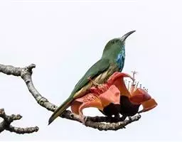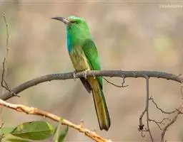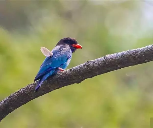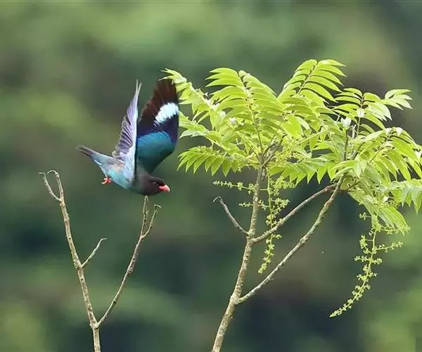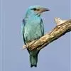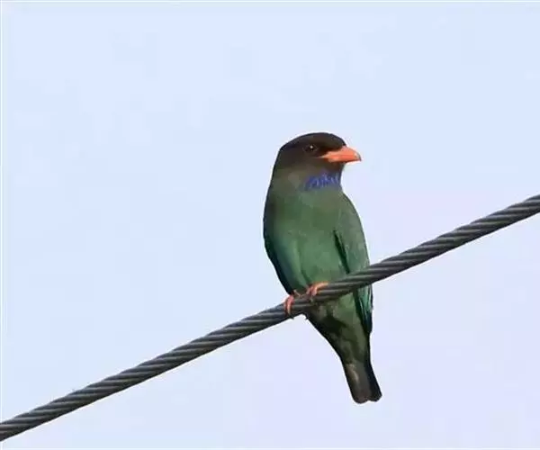 三宝鸟(学名:Eurystomus orientalis)为佛法僧目三宝鸟属下的一种中小型攀禽,共有10个亚种,体长26-29厘米,体重107-194克。通体蓝绿色,头和翅较暗,呈黑褐色,初级飞羽基部具淡蓝色斑,飞翔时甚明显。虹膜暗褐色,嘴、脚红色。常长时间地站在林缘路边高大乔木顶端枯枝上,或在空中成圈飞翔和上下飞翔,边飞边“嘎嘎”地鸣叫。 如发现飞行中昆虫,则追赶捕食,如果在地上发现蜥蝪或昆虫,则如伯劳采饵,在地上以跳跃代步行捕食。