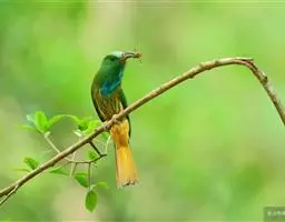 三宝鸟,是佛法僧目佛法僧科三宝鸟属中小型攀禽。成鸟通体为富有光泽的墨蓝绿色,…